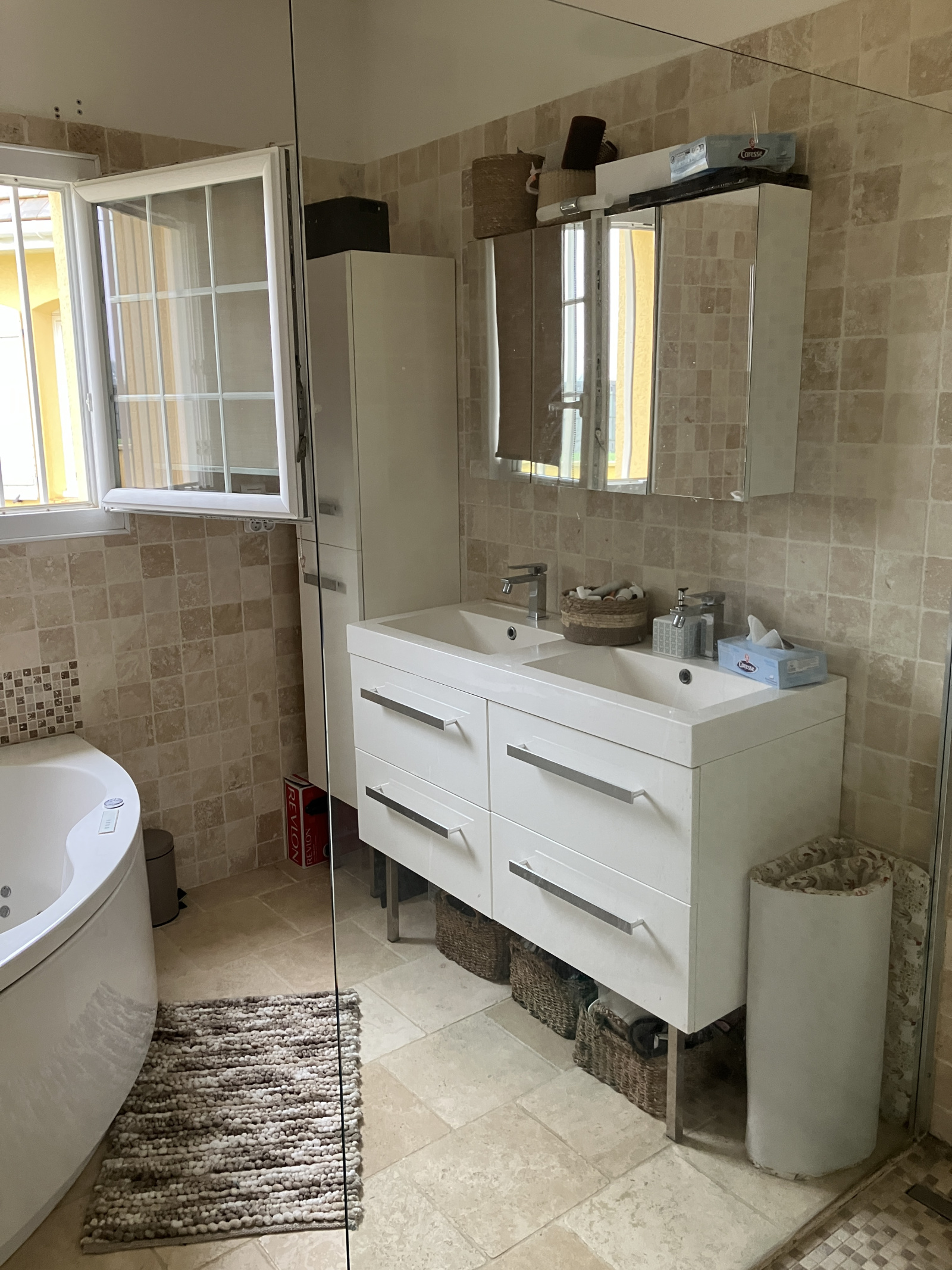 L’habitation, d’une surface habitable de 85 m² environ, comprend au rez-de-chaussée : entrée de 4.77 m² avec placard, séjour de 26.90 m² avec cheminée insert et porte-fenêtre donnant sur terrasse, cuisine aménagée et équipée de 13.01 m², deux chambres dont une avec placard (13.85 m² et 9.85 m²), salle de bains/douches de 7.19 m² avec double vasque et baignoire Balnéo, wc séparé.