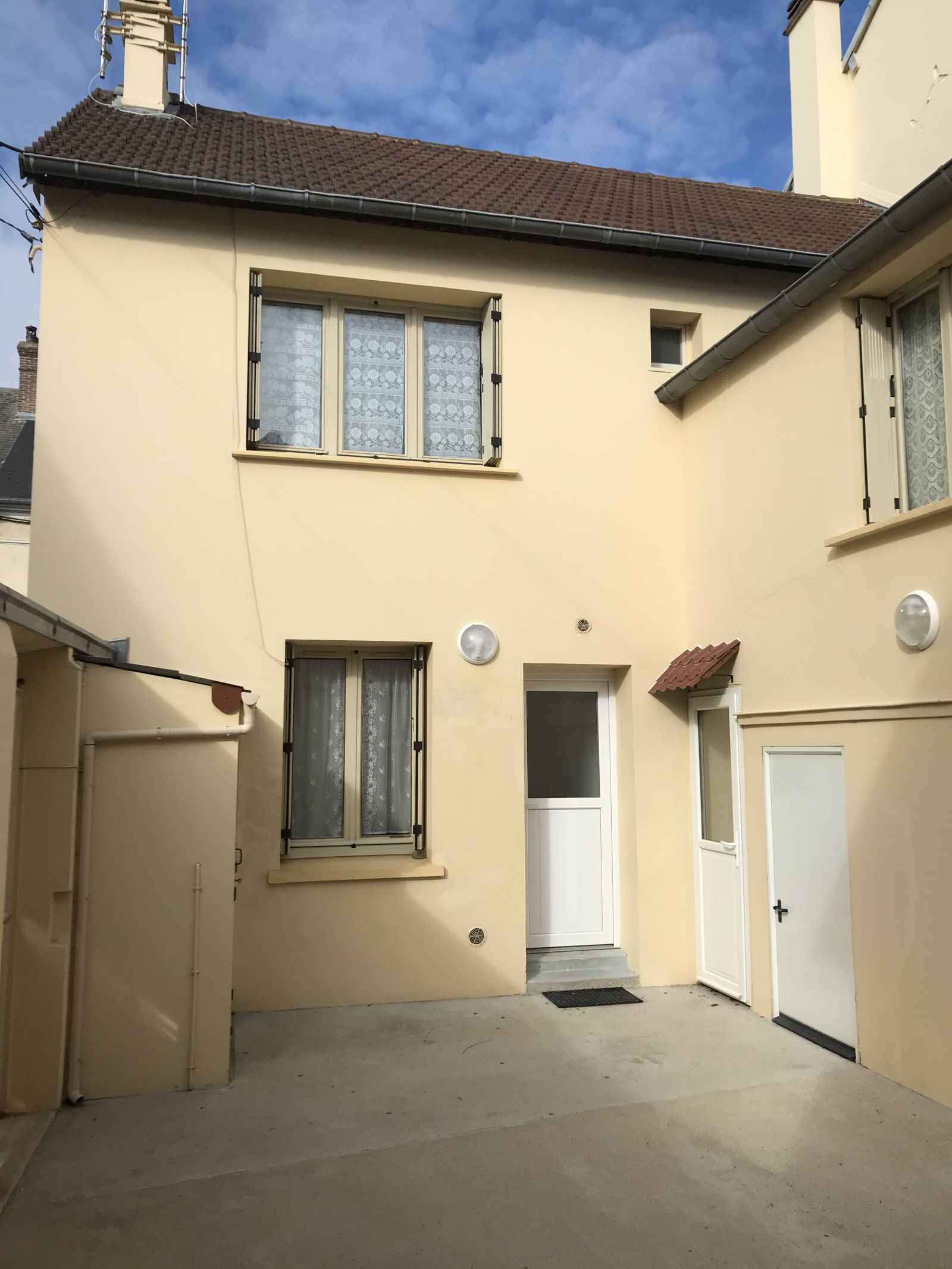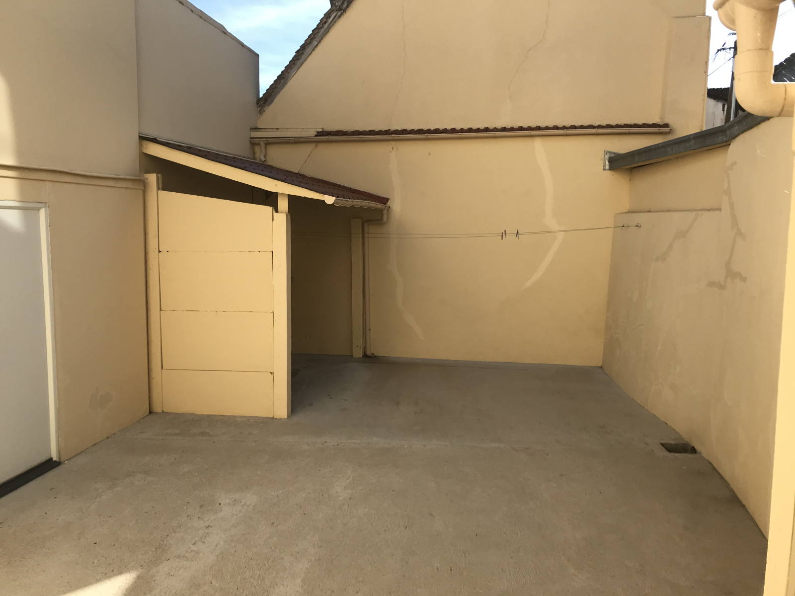 Cour avec 2 celliers/rangements. Local poubelles.