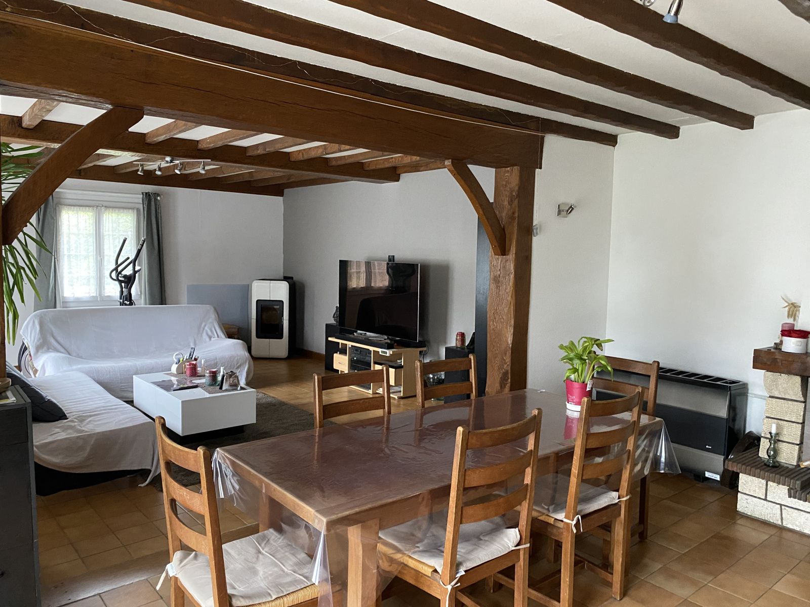 Tout confort : chauffage électrique, poêle raccordé au gaz de ville, double vitrage, tout à l'égout, fibre.