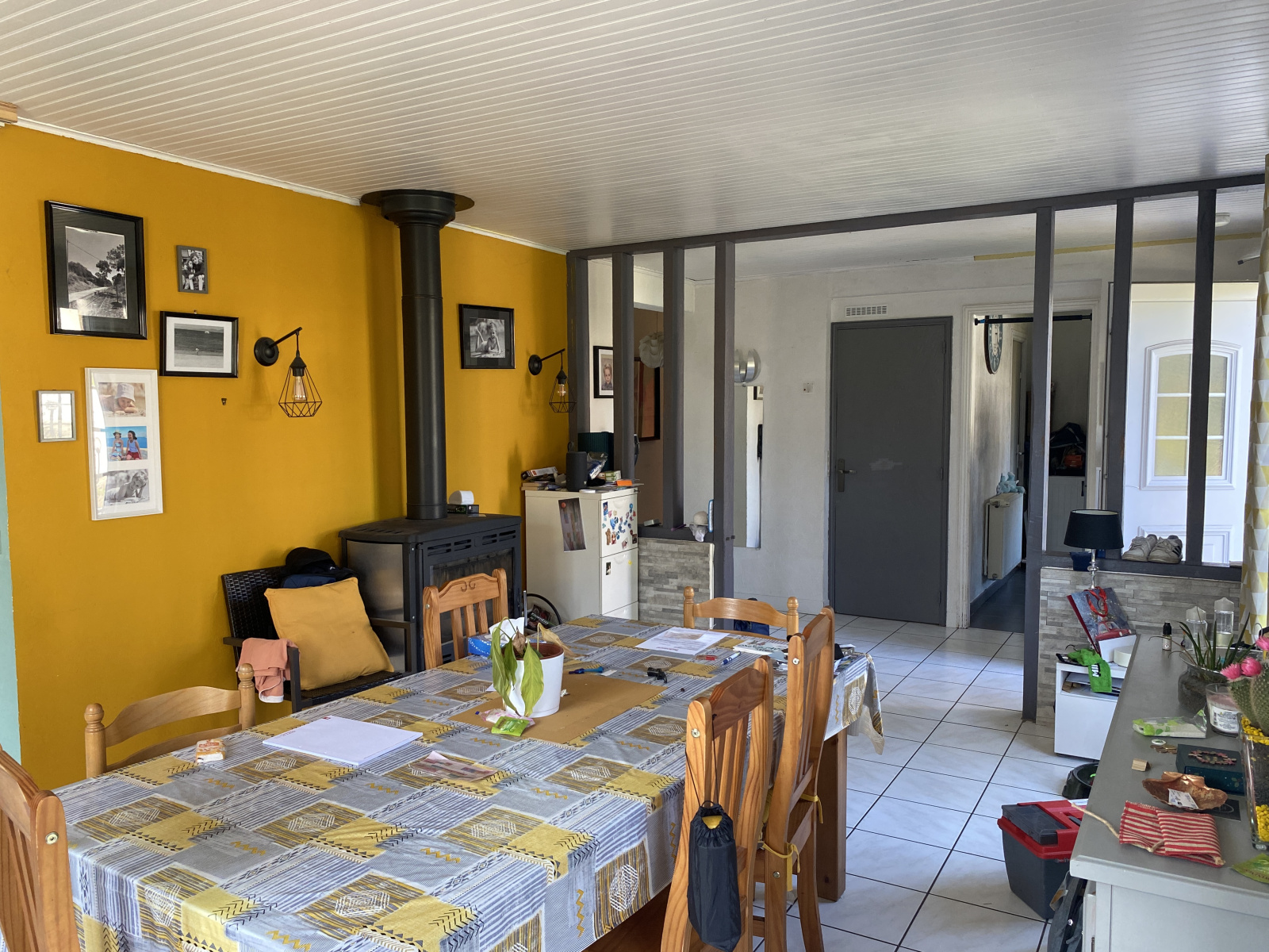 L’habitation comprend au rez-de-chaussée : entrée, séjour de 39.80 m² avec poêle à bois, cuisine aménagée de 10.49 m², chambre de 13.16 m², salle de bains/wc de 6.36 m². À l’étage : palier desservant de 9.85 m², deux chambres (19.87 m² et 12.96 m²), dégagement, wc de 7.51 m² avec lavabo, grenier de 14.94 m².