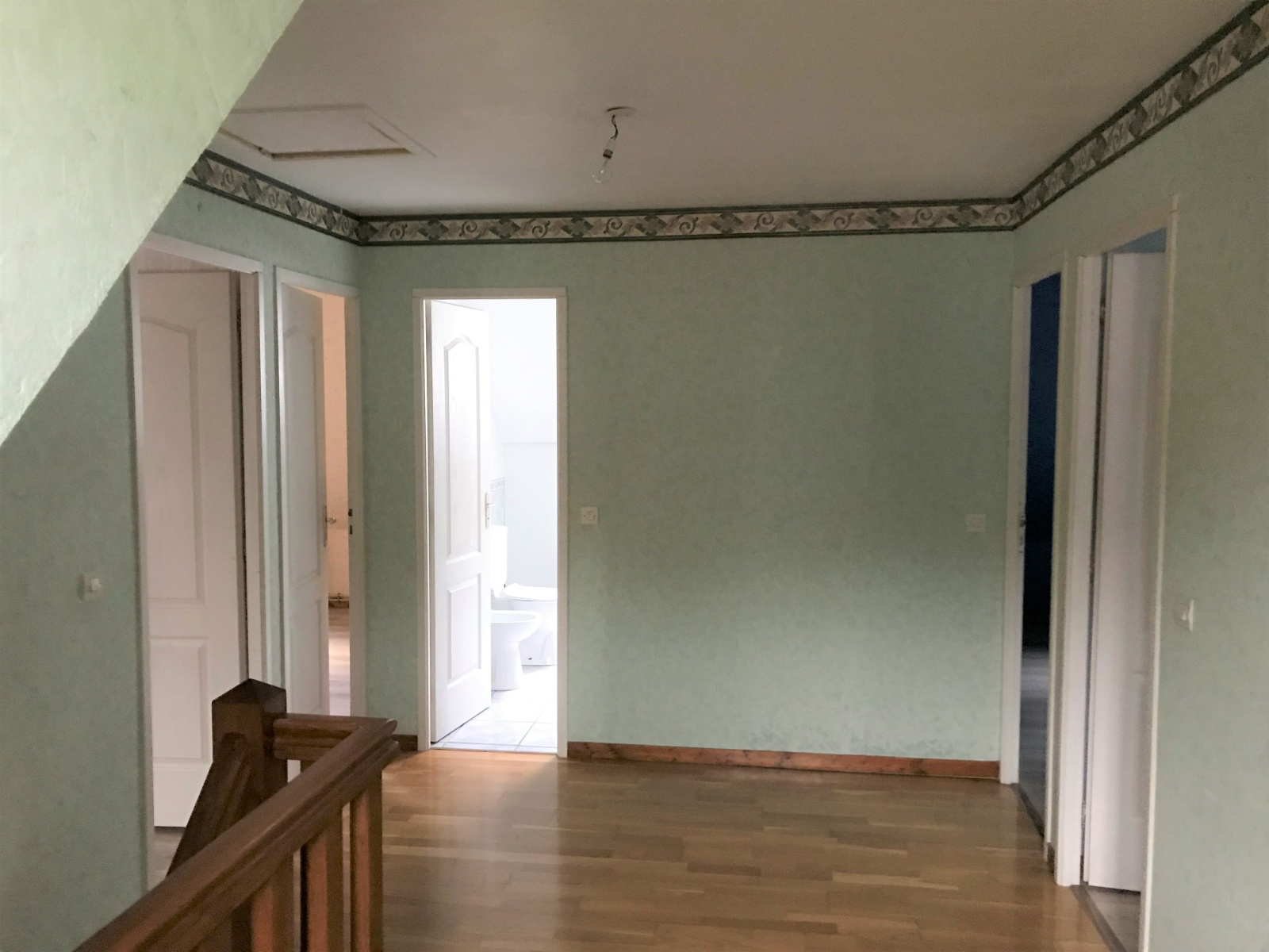 L’habitation comprend au rez-de-chaussée : entrée, séjour de 29.70 m² avec cheminée insert, cuisine ouverte de 11.37 m², buanderie de 5.41 m², salle de douches/wc de 3.48 m². À l’étage : palier de 9.36 m², quatre chambres (12.78 m², 11.80 m², 10.54 m² et 10.34 m²), salle de bains/wc de 5.22 m².