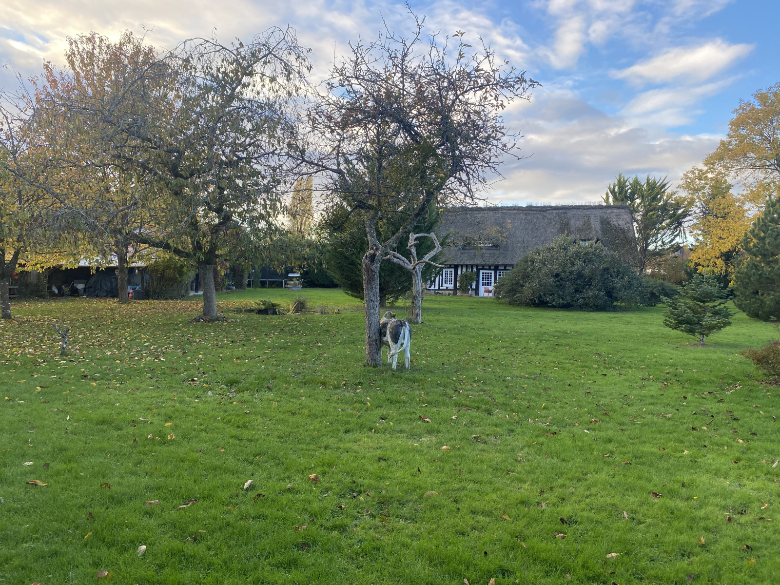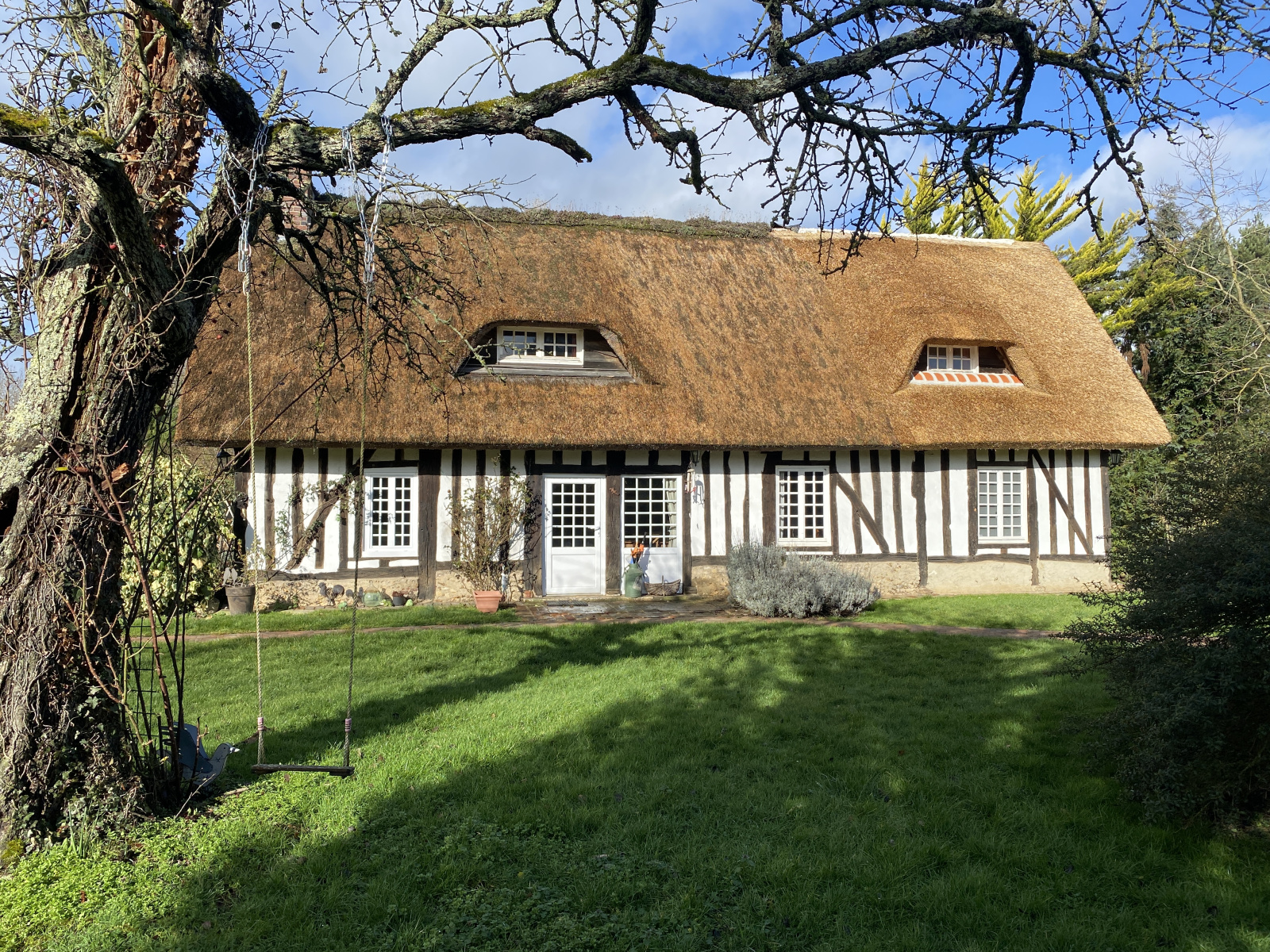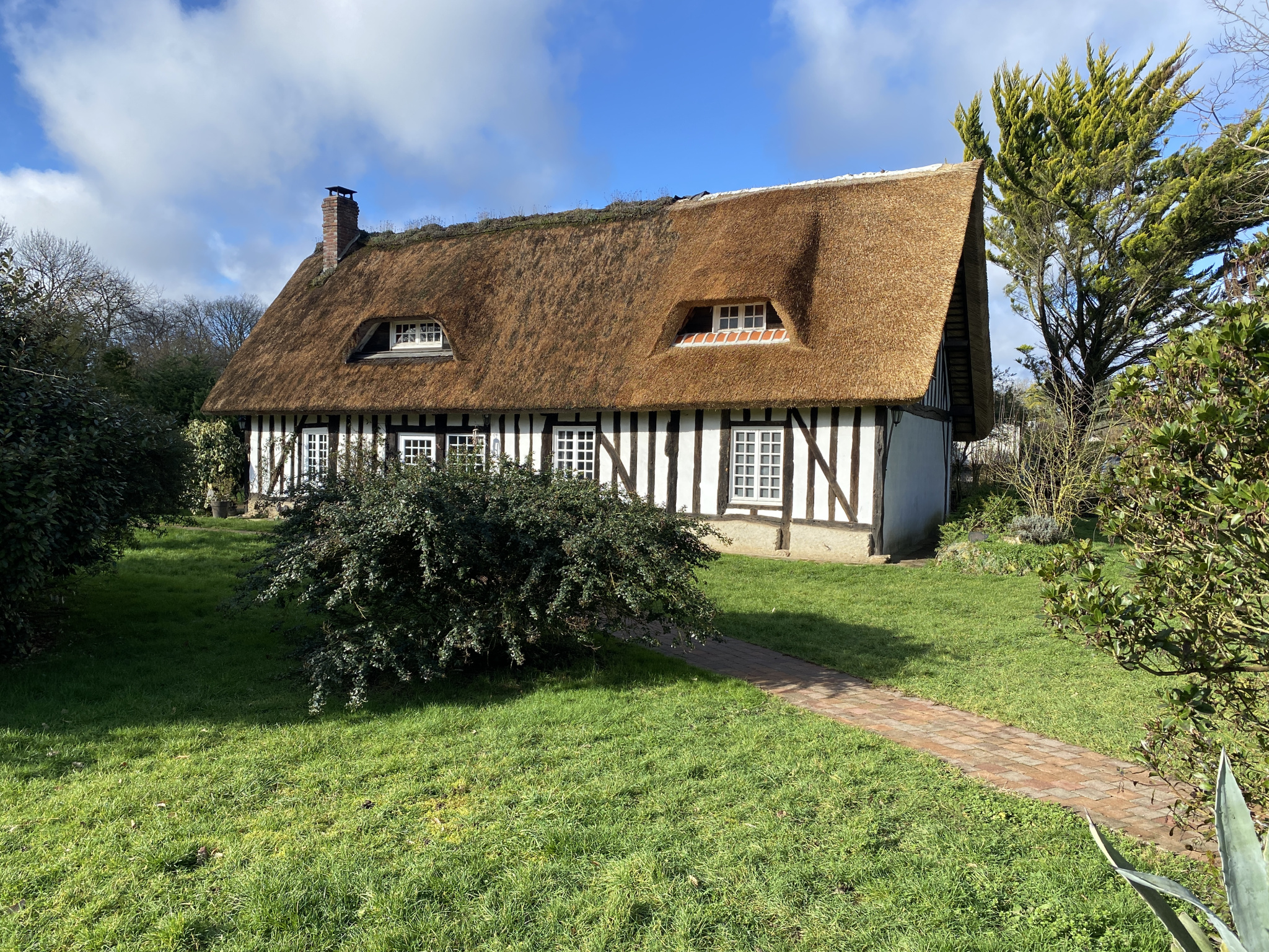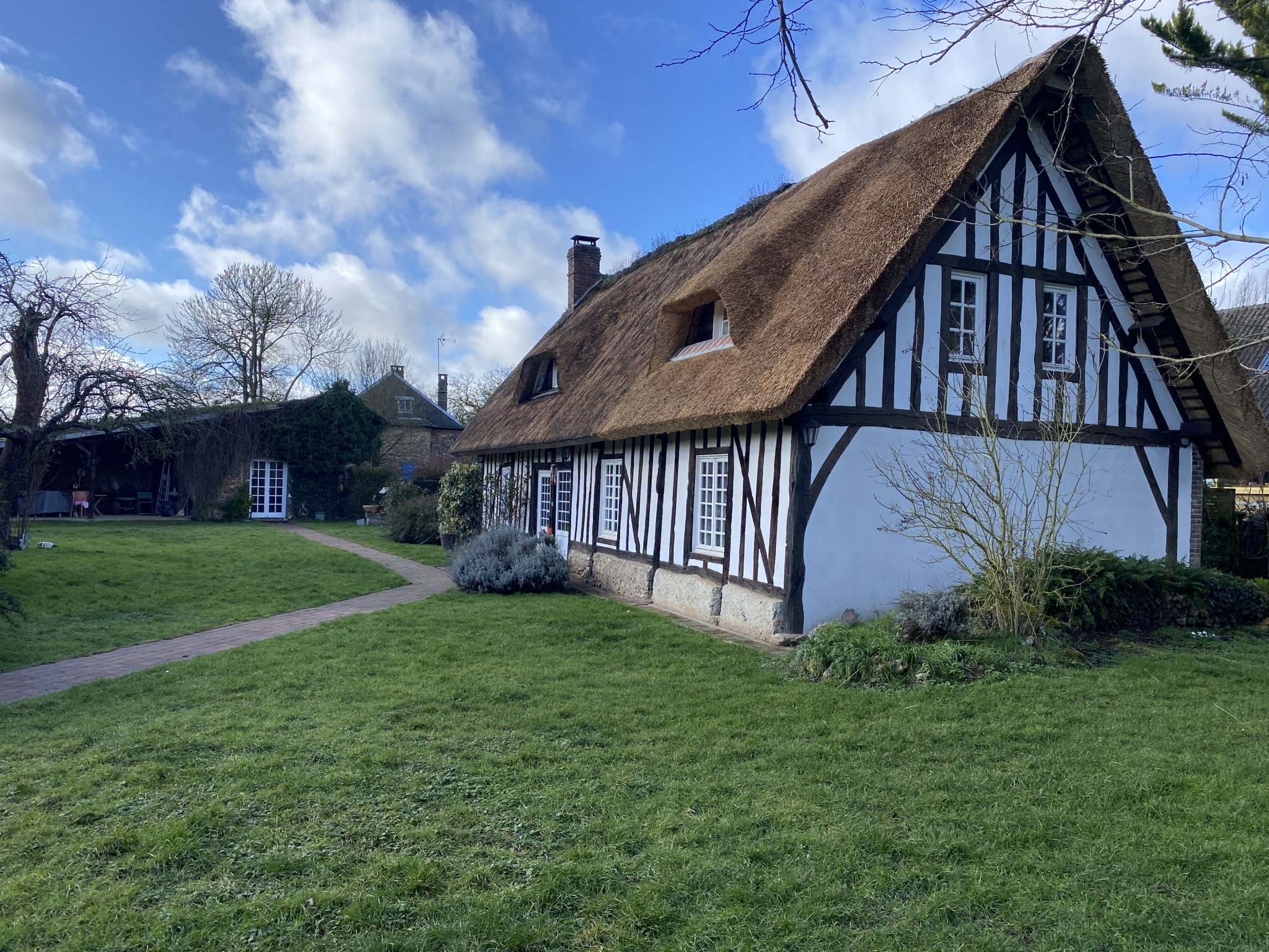 Belle maison ancienne à colombages située dans un village et édifiée sur un beau terrain arboré.