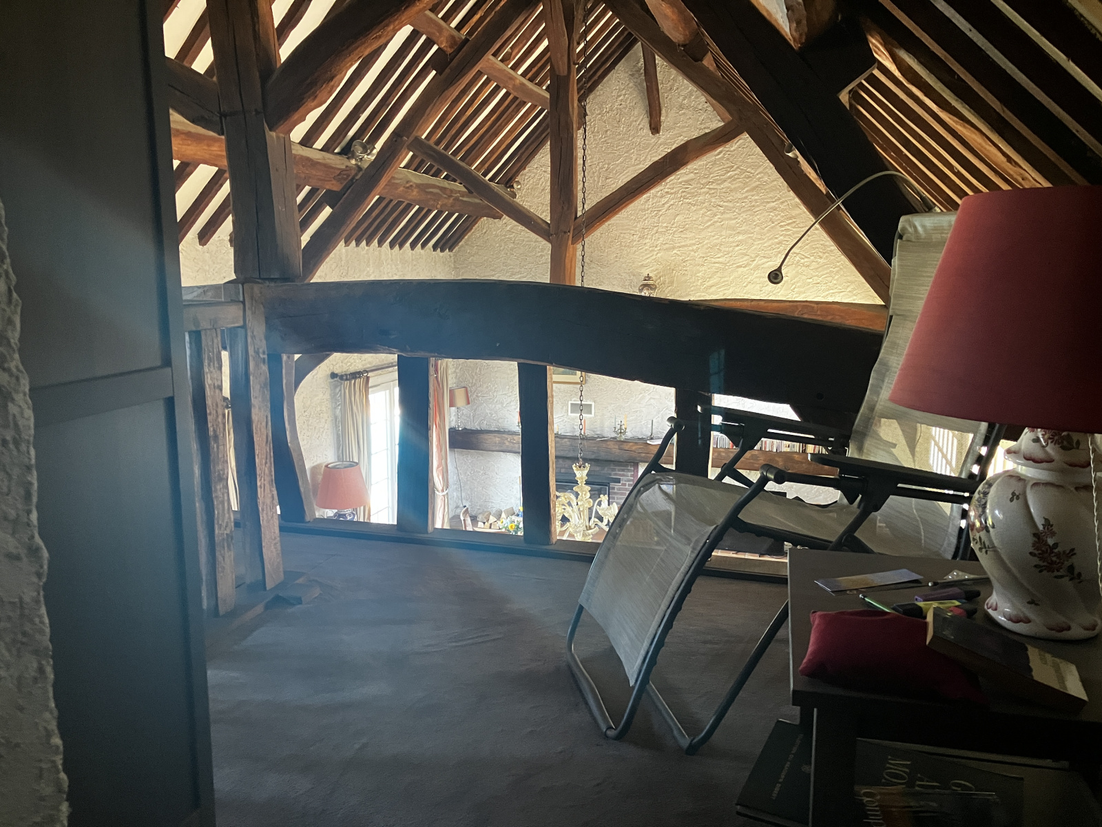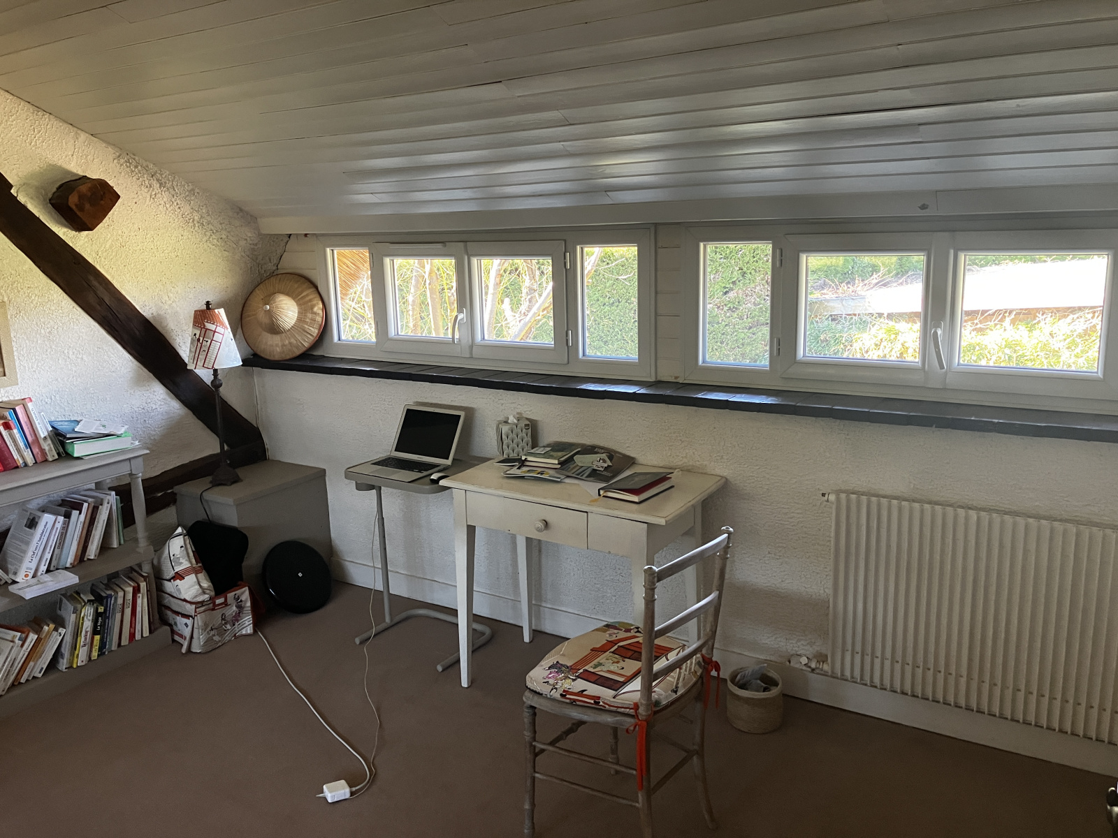 L’habitation comprend un sous-sol partiel avec cave et chaufferie. Au rez-de-chaussée : entrée de 10.03 m², salon-salle à manger de 43.20 m² avec cheminée insert et toit cathédrale, cuisine aménagée de 7.9 m², deux chambres (10.56 m² et 10.11 m²), bureau de 9 m², salle de douches/wc de 4.67 m². À l’étage : mezzanine à usage de bibliothèque, deux chambres (16.11 m² et 10.42 m²), salle de bains de 5.43 m², wc indépendant.