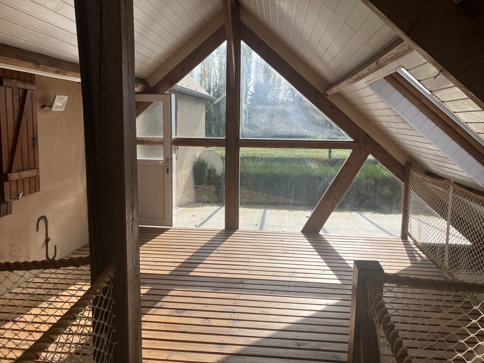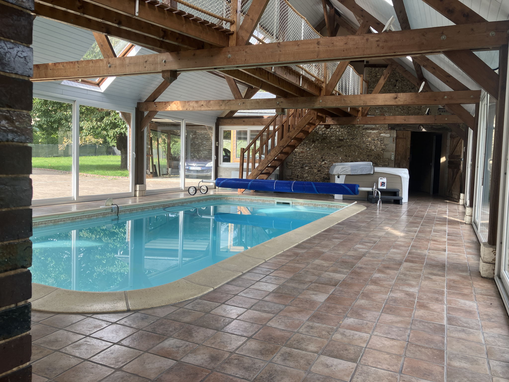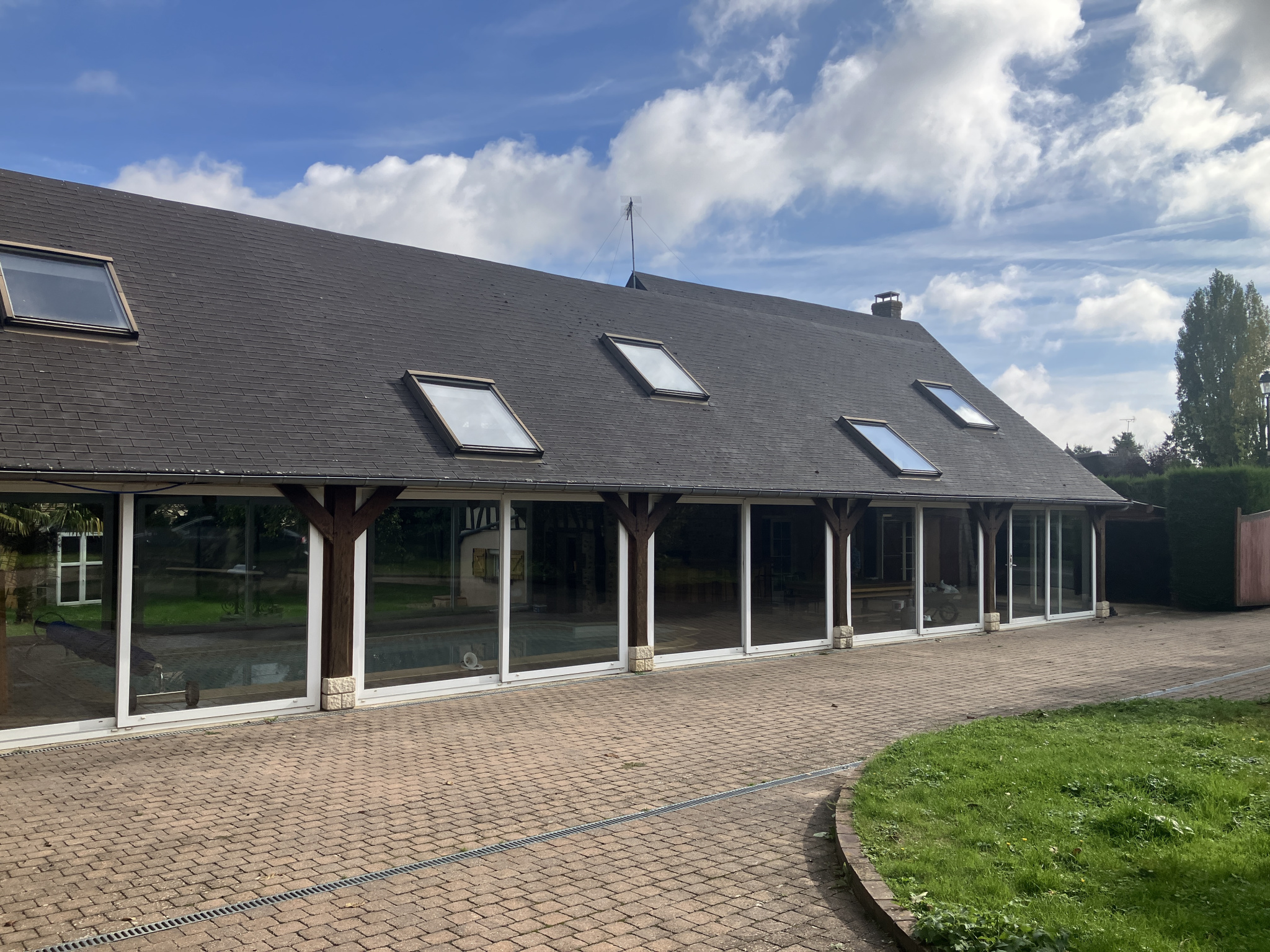 La maison, d’une surface habitable d’environ 110 m², comprend un sous-sol avec cave et salle de douches/wc. Au rez-de-chaussée : entrée, salon-salle à manger de 50.76 m² avec cheminée, cuisine américaine aménagée de 15.85 m², pièce de 11.68 m² avec wc, lavabo et buanderie, pièce de 102.22 m² à usage de piscine couverte avec bar et jacuzzi, pièce technique de 11.64 m², salle de jeux de 47.73 m². À l’étage, par escalier principal : palier, trois chambres (13.15 m², 13.79 m² et 26.58 m²) dont une avec salle de douches et lavabo ; par escalier secondaire : chambre de 26.66 m² avec douche, lavabo et wc.