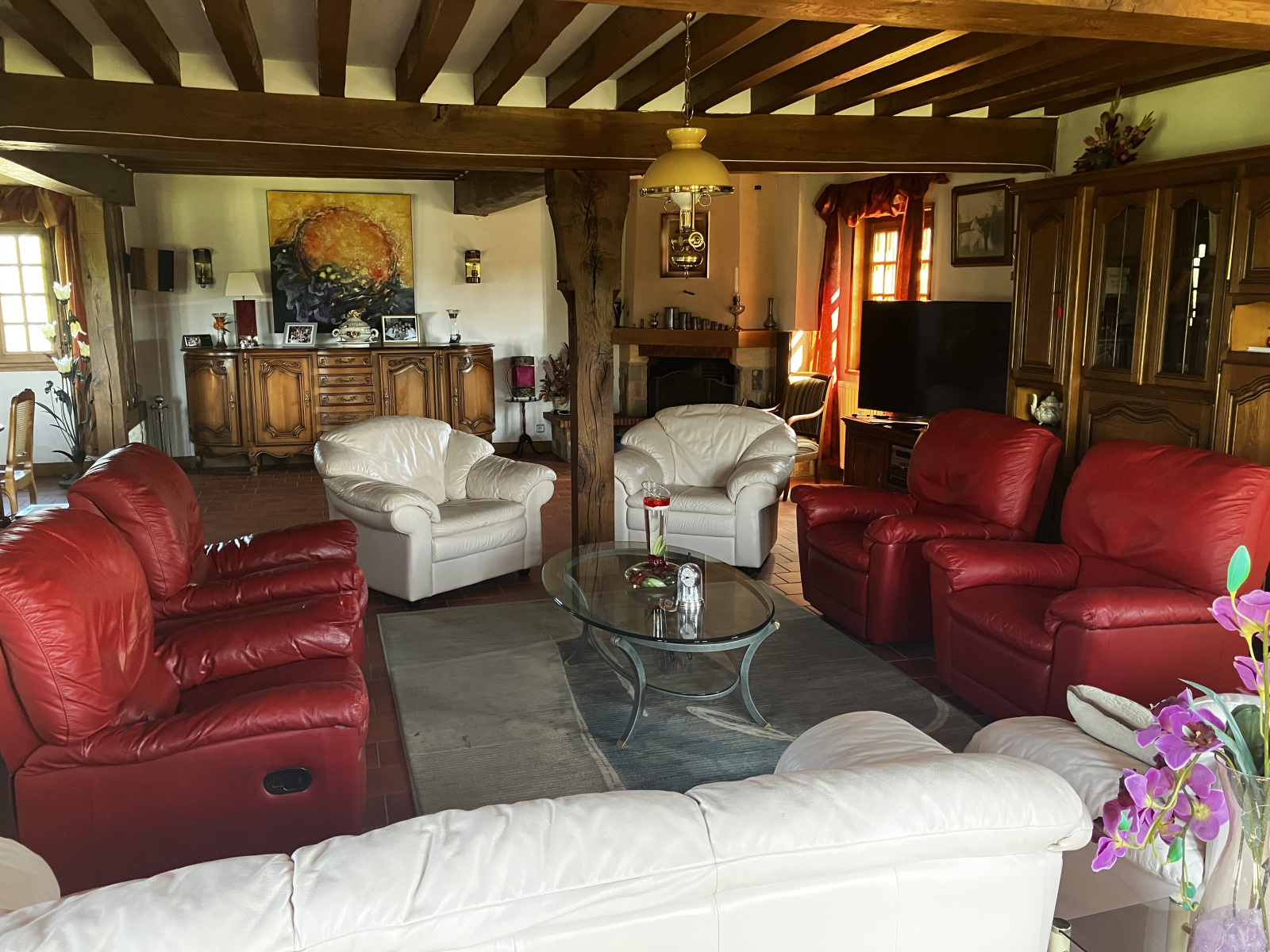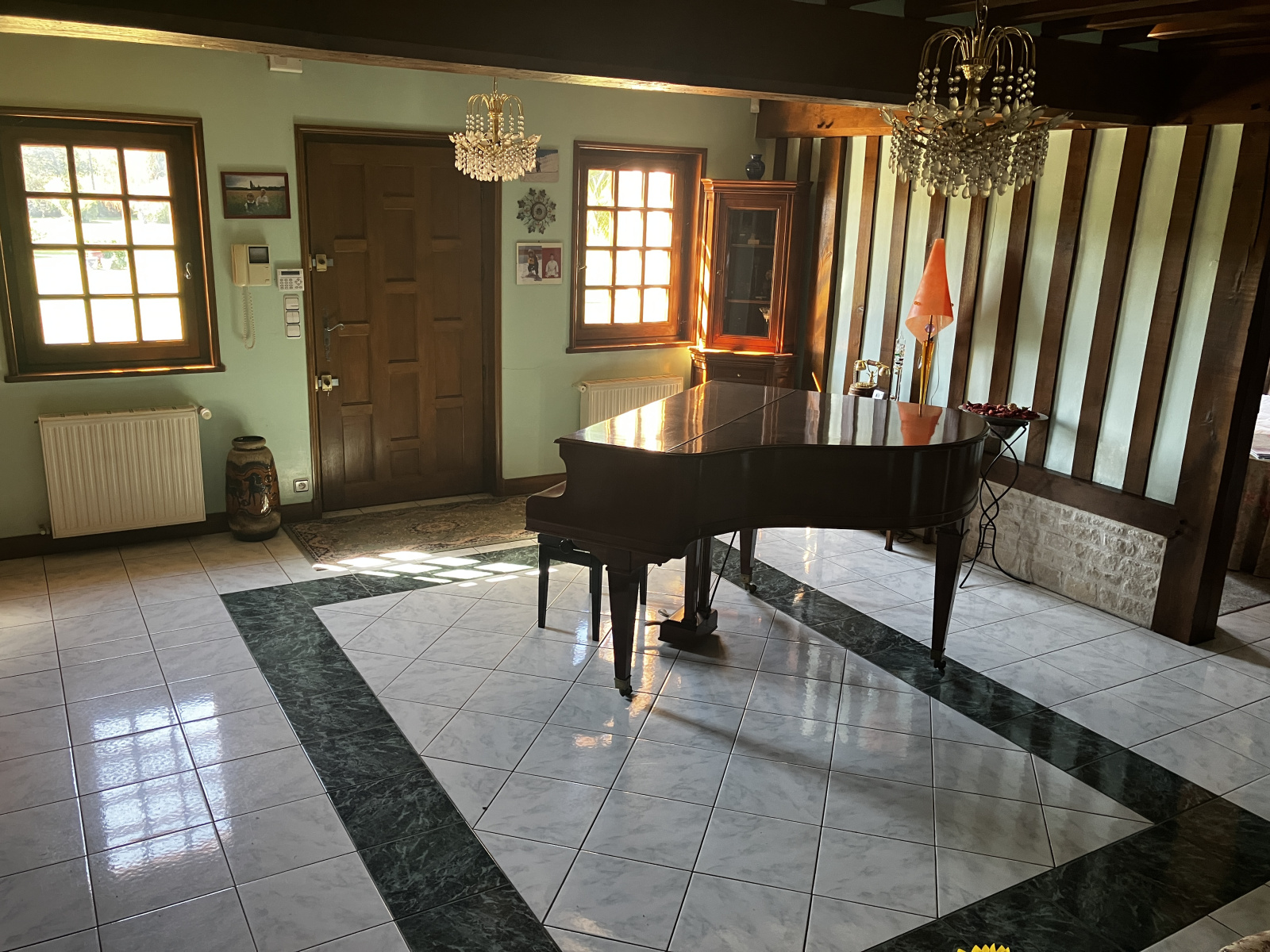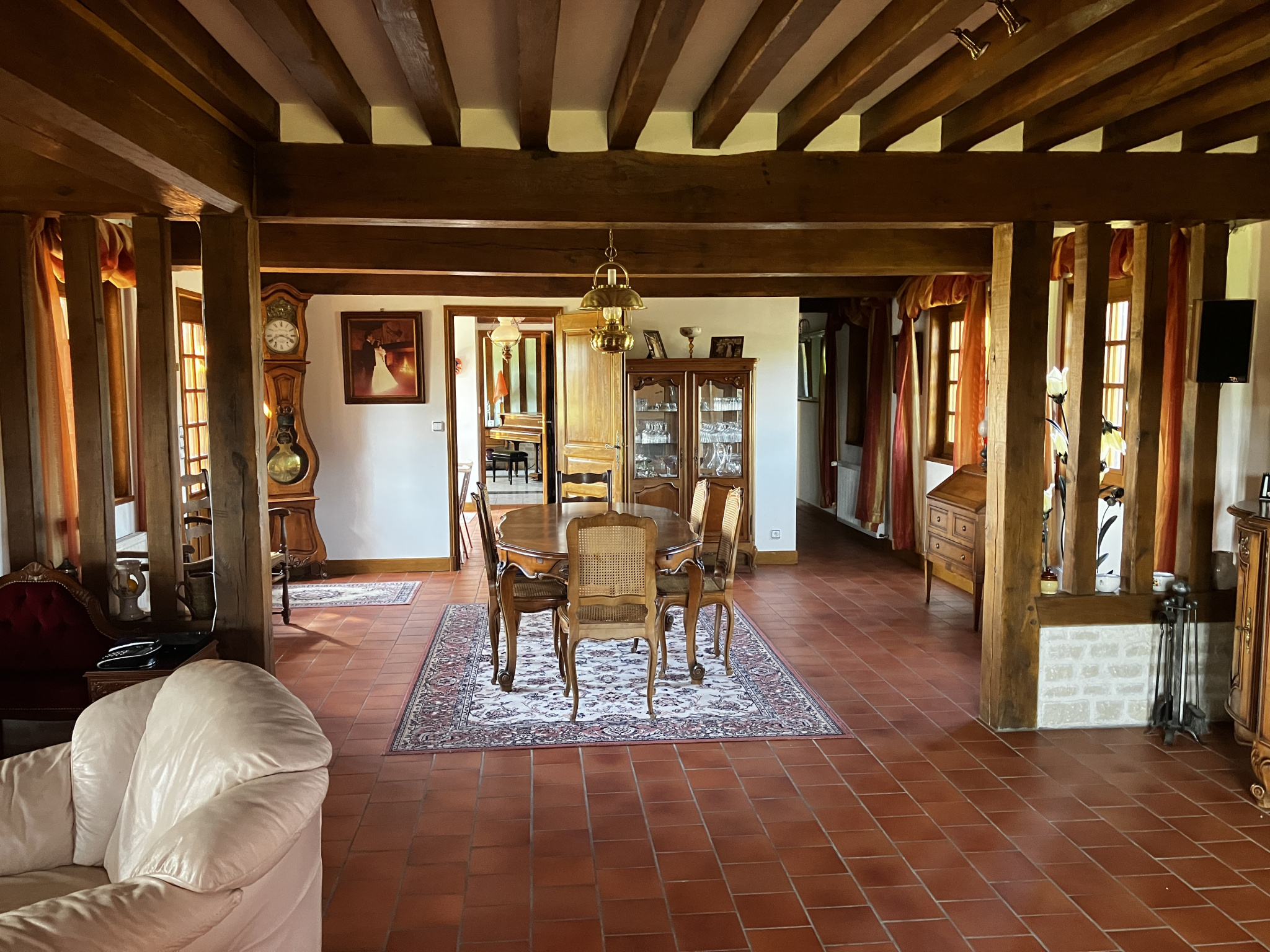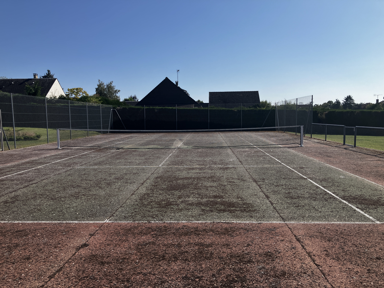Jolie propriété traditionnelle à colombages édifiée sur un grand terrain arboré avec tennis et située dans un village avec commerces et écoles.