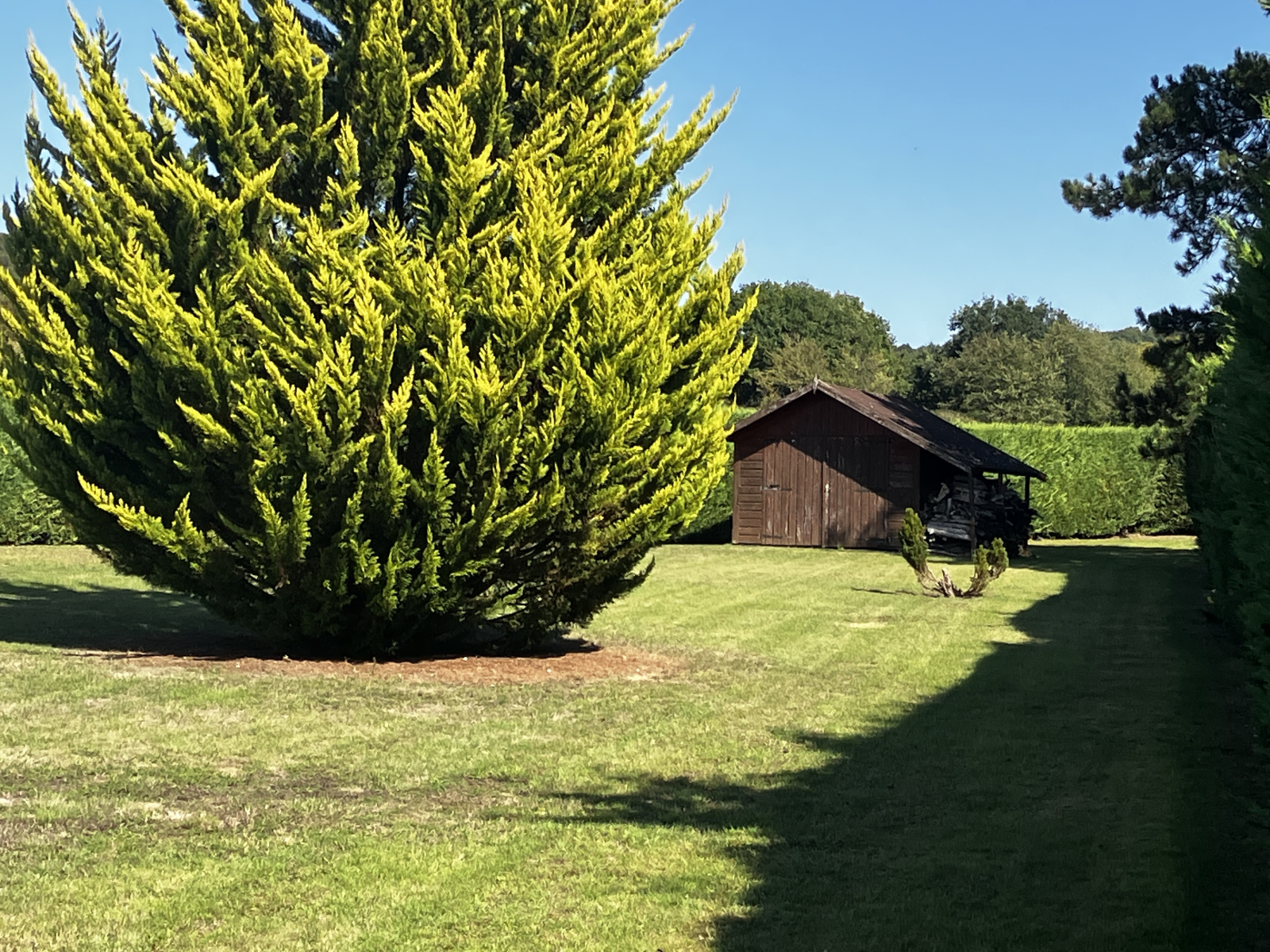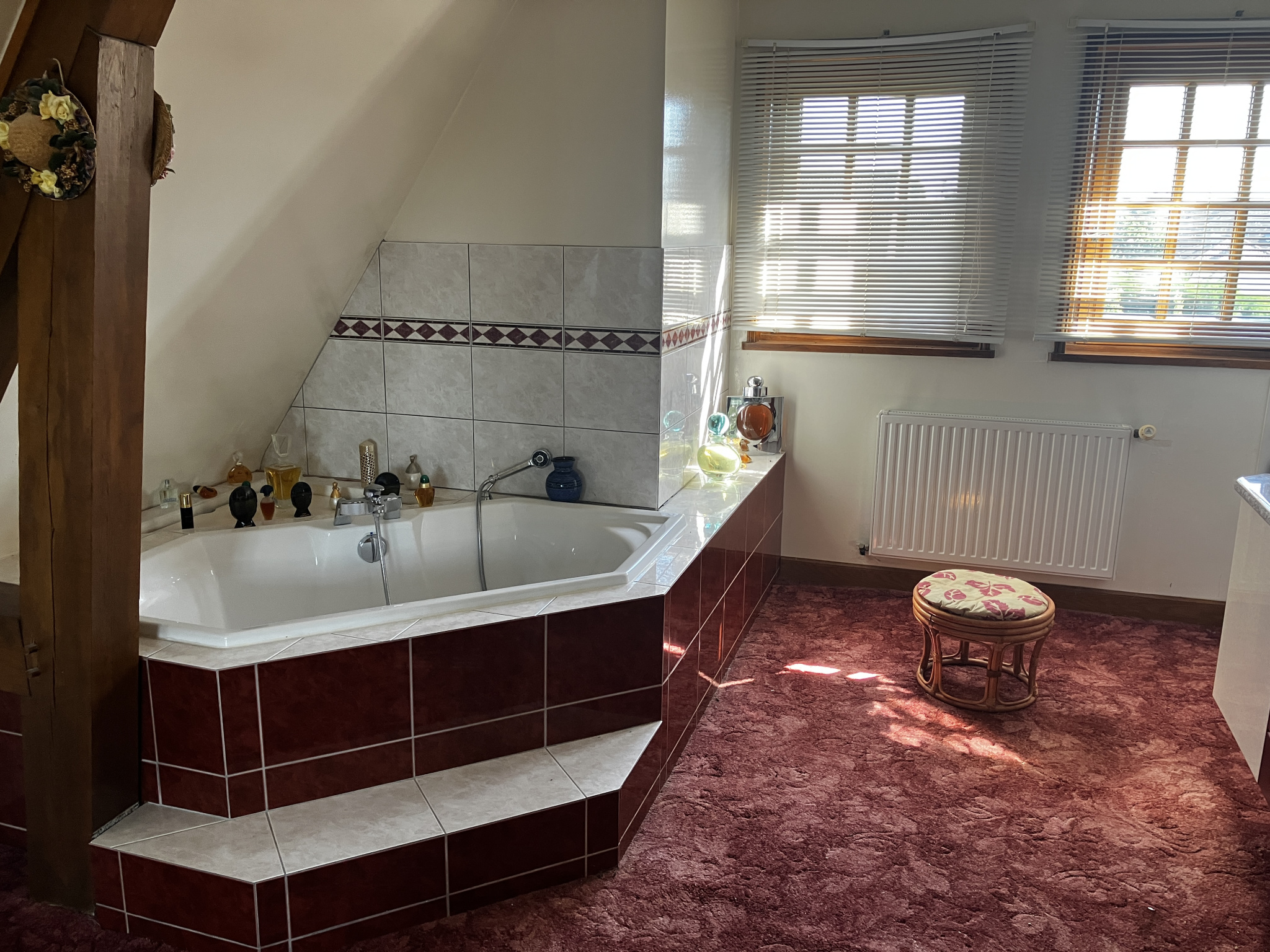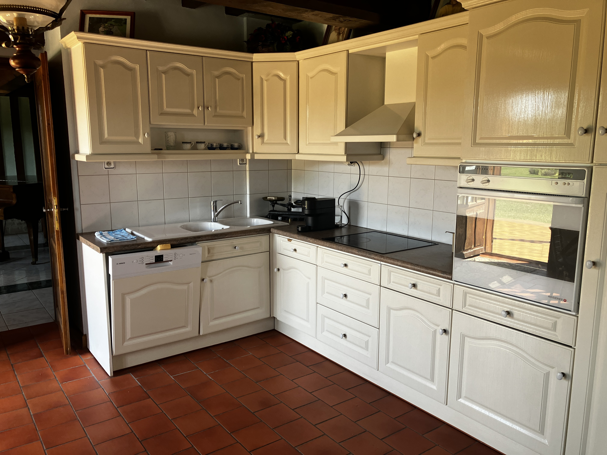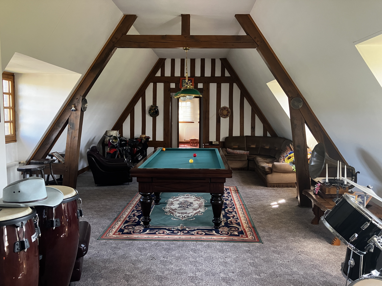 Jolie propriété traditionnelle à colombages édifiée sur un grand terrain arboré avec tennis et située dans un village avec commerces et écoles.