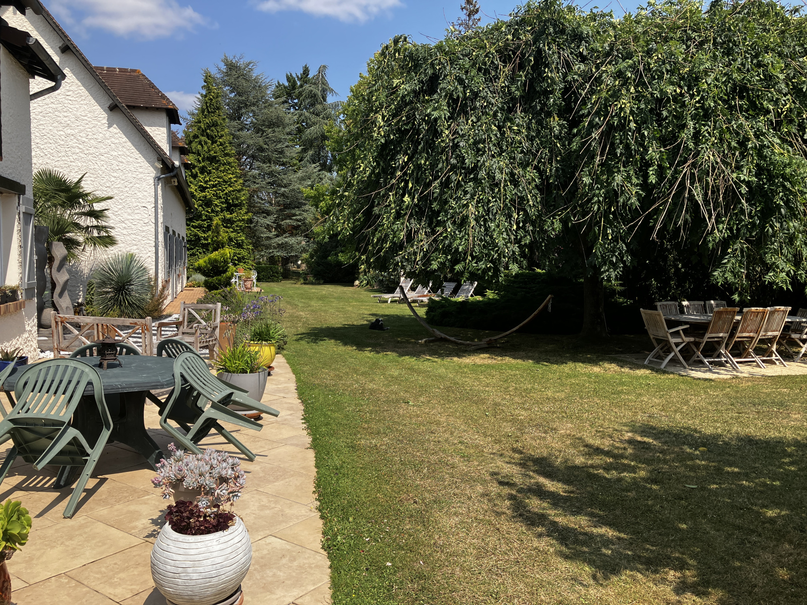 Jolie propriété traditionnelle composée d’une maison principale et d’une maison d’amis et édifiée sur un grand terrain arboré.